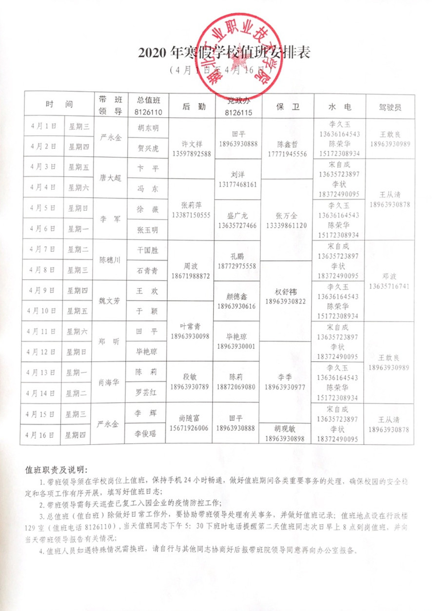 2020年寒假学校值班安排表(4月1日——4月16日)