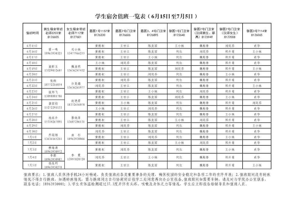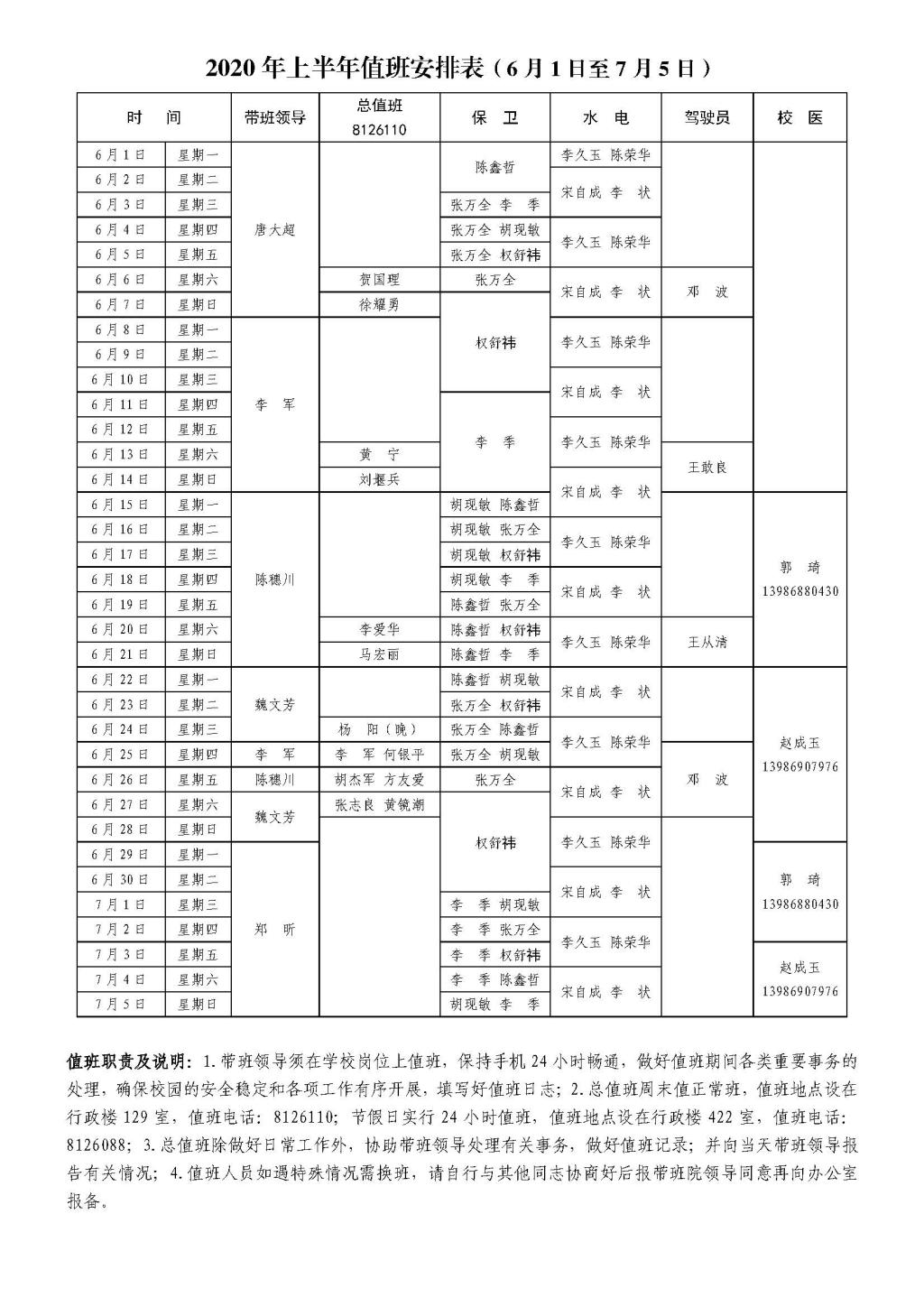 2020年上半年值班安排表(6月1日至7月5日)