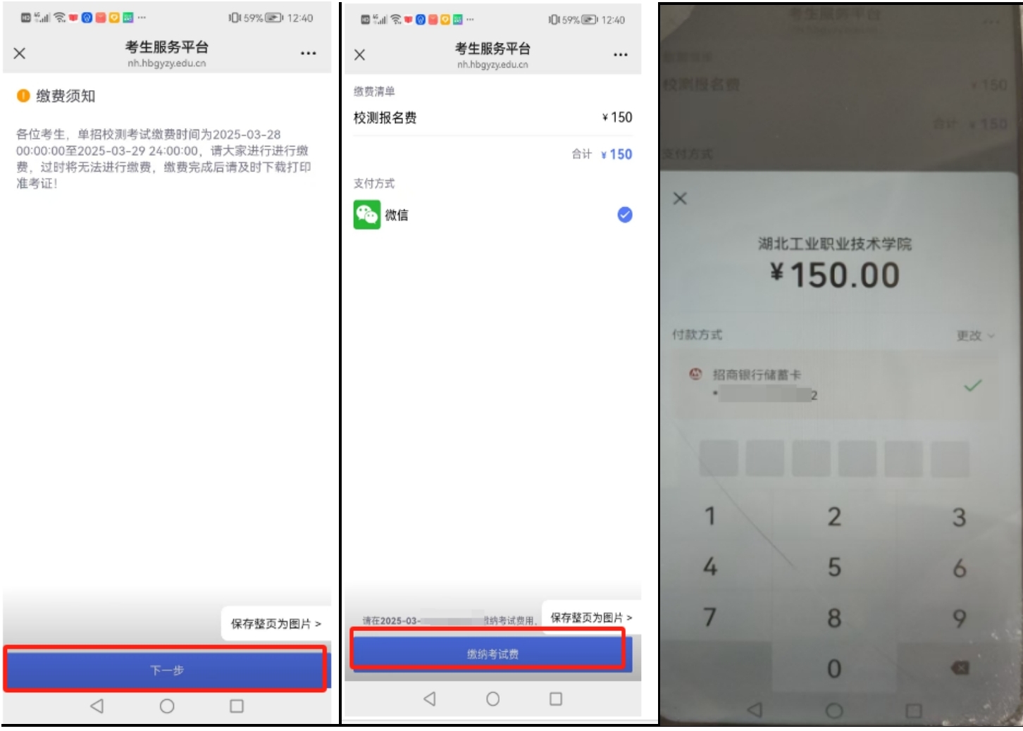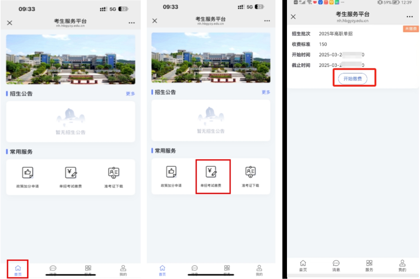 点击"首页"按钮回到主页,在"常用服务"里点击"单招考试缴费",进入缴费页面,如下图所示步骤顺序完成缴费: