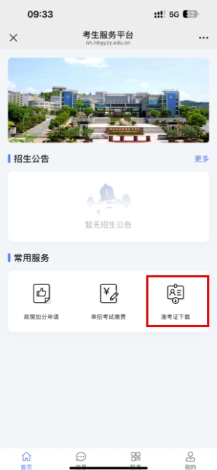 6.1点击"首页"按钮回到主页,在"常用服务"里点击"准考证下载",进入准考证页面,如下图所示: