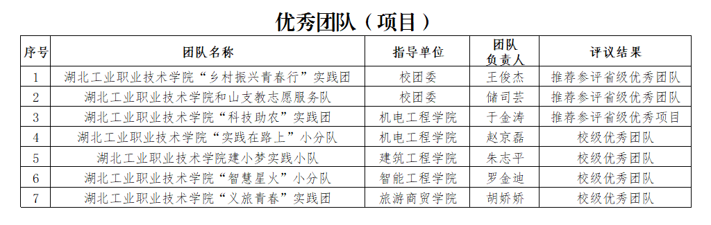 根据团省委、省学联《关于开展2022年湖北省大中专学生志愿者暑期文化科技卫生“三下乡”“返家乡”社会实践活动总结和通报工作的通知》及学校《关于开展 2022 年“三下乡”“返家乡” 社会实践活动总结及省级、校级优秀评选工作的通知》等文件相关精神。经宣传发动、二级学院推荐、组织校级评审等程序,我校拟推荐“乡村振兴青春行”三下乡社会实践团队等2个团队、1个项目和1个优秀个人为省级优秀候选,并报送团省委参评,拟表彰“星空线上平台建小梦实践小队”等4个团队和10名同学为校级优秀团队和个人(具体名单附后),先予以公示。