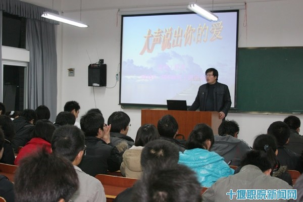此次活动是响应《十堰晚报》等十家媒体为庆祝三八国际妇女节而发起的“大声说出你的爱”大型公益活动。建筑工程系党总支副书记王厚兵在活动开始前,带领大家回顾了各自寒假里为父母所做的事,进行了“你所了解的父母”问卷调查,并算了一笔“读书账”。随后向在座的同学发放了感恩亲情明信片,同学们纷纷拿出手中的笔,在明信片上写下了自己要对父母说的话,并准备把它寄给父母。在王老师的提议下,大家踊跃上台说出了自己对父母的愧疚以及他们对父母的承诺。同学们还集体朗诵了《学会感激》诗篇,最后在大家合唱的《感恩的心》动人旋律中落下了帷幕。