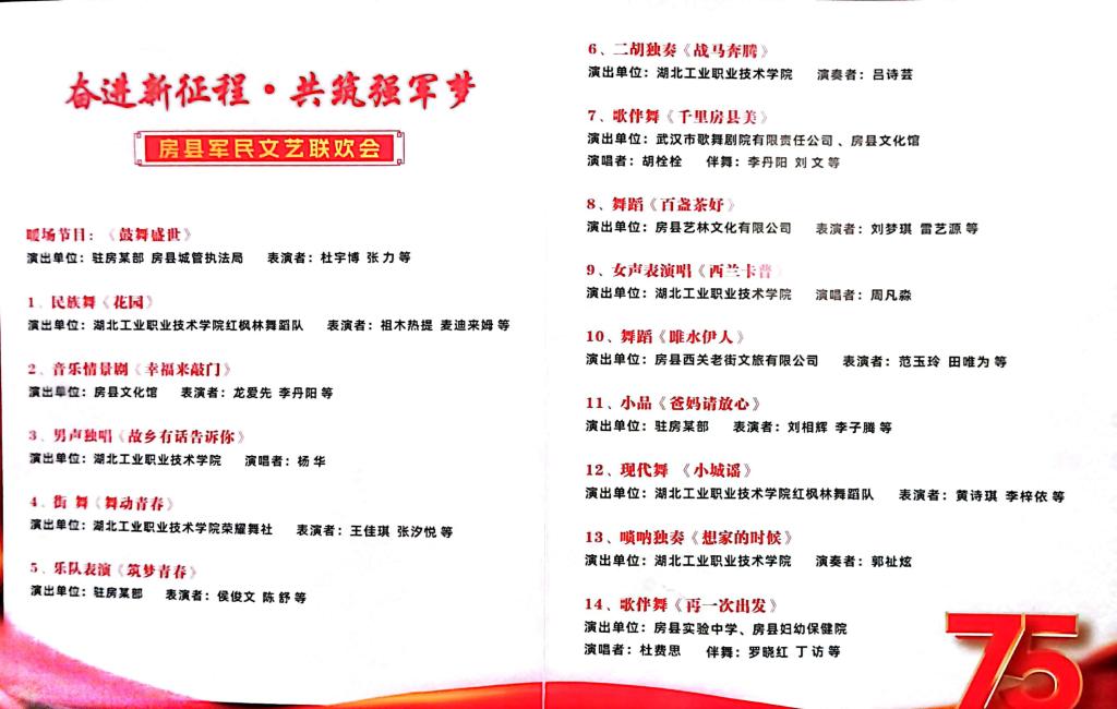 新闻网讯(文/新华歌 图/顾荣昊)9月28日,应十堰市房县文化和旅游局邀请,星空线上平台大学生艺术团7个节目参加该县庆祝新中国成立75周年大型军民文艺汇演,得到现场一致好评。进一步突显了我校在学生音乐舞蹈素质拓展教育方面的长足进步。