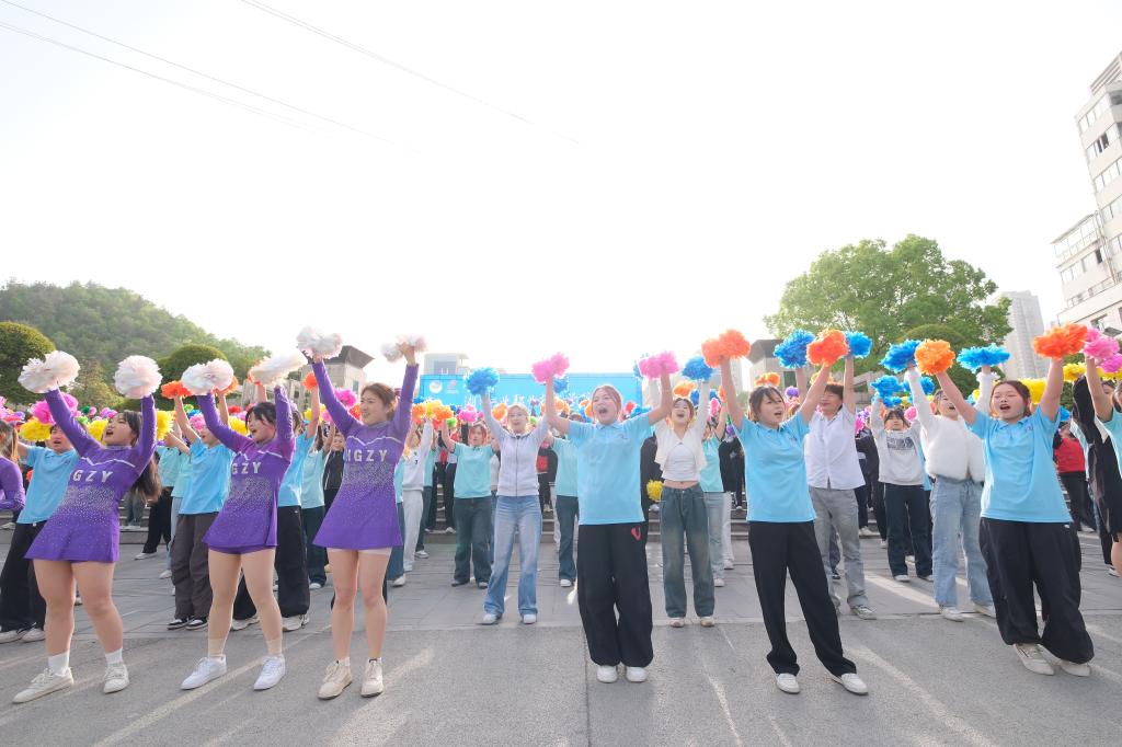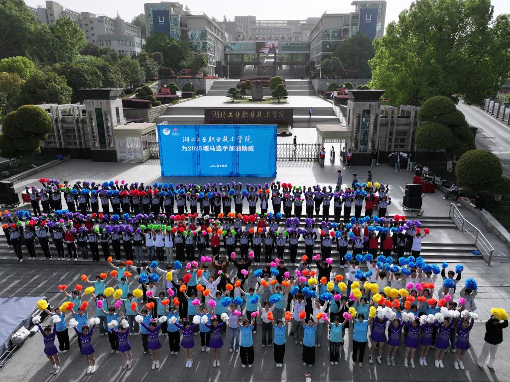 赛事路线经过湖工职院门口,三百多名师生组成的啦啦队现场助威,同时带来《奔跑》《啦啦操》等精彩节目,花球舞动、歌舞热情,赢得选手们纷纷挥手回应。