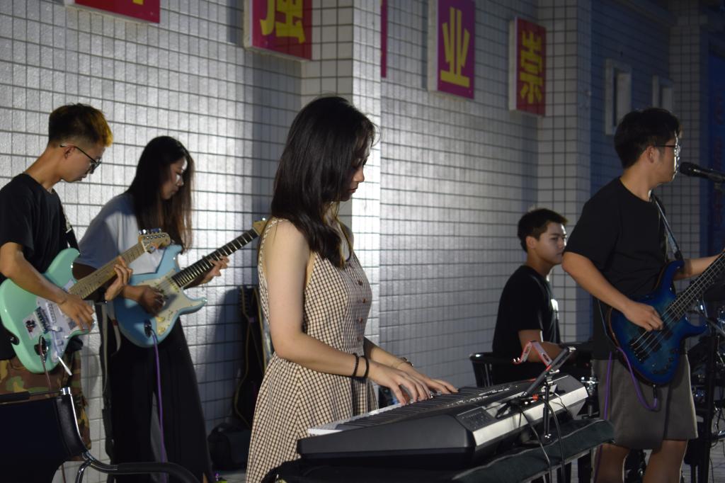 在近四个小时的时间里,无论是乐手还是观众,激情和热情一浪高过一浪,点燃了全场气氛。来自我校的天一乐团“冰点乐队(icepoint)”一上场,尖叫声、呐喊声此起彼伏,一曲《极乐都市》、《奇迹再现》更是引得全场掌声雷动。来自汉江师范学院贰天乐队的安琦带着《想去海边吗》、《爱人错过》等金曲,轮番上台、激情演奏,感染了在场所有观众。